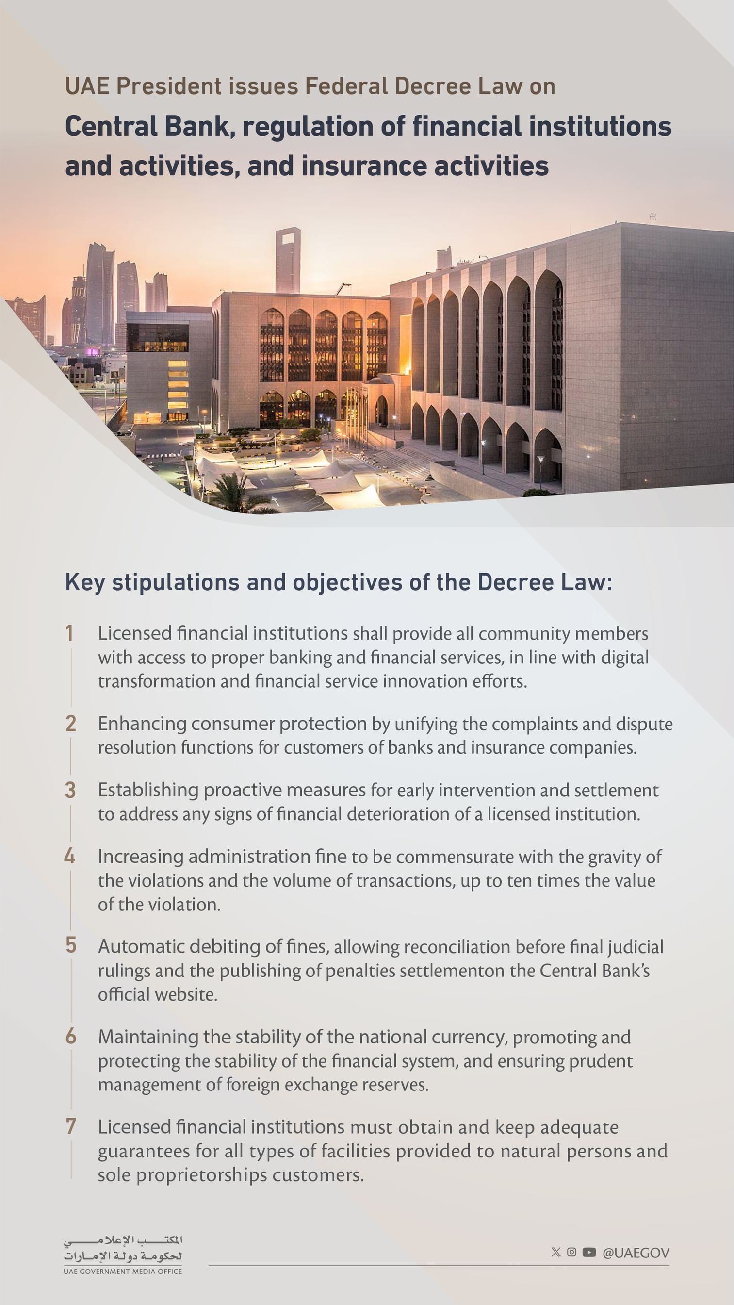 UAE President issues Federal Decree Law on Central Bank, regulation of financial institutions, insurance activities